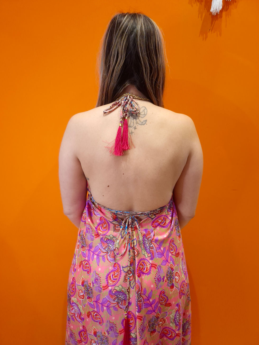 Le design taille unique est réglable avec des cordons derrière le cou et le dos, permettant un ajustement parfait à chaque morphologie.